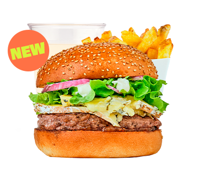 Blue Cheese (Pain BB légèrement brioché garni d’un steak de boeuf frais 100% pur boeuf, de 2 tranches de fourme d’Ambert, de salade, de confiture figue et miel, d’oignons rouges…