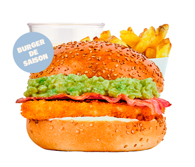 Chicken Avocado (Pain légèrement brioché garni d’un pané de poulet croustillant, de guacamole maison, d’une tranche de poitrine de porc fumée croustillante accompagnés d’une mayonnaise) + homemade side + BB…