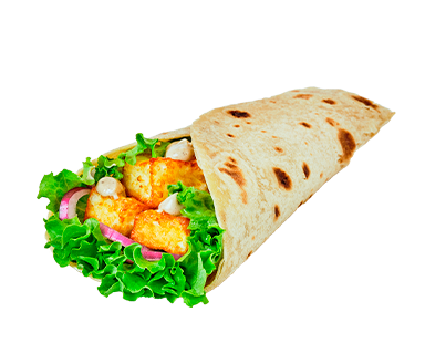 Piadina garnie de cubes de halloumi frit, de salade, d’oignons rouges accompagnés de notre sauce au poivre Ce produit est disponible dans le restaurant Bioburger Gobelins, Bioburger Oxygen, Bioburger Rosa…