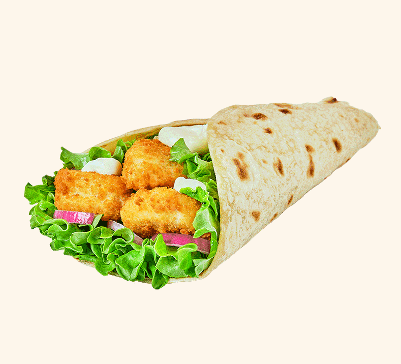Piadina garnie de poulet pané, de salade, d’oignons rouges accompagnés de mayonnaise et de miel
