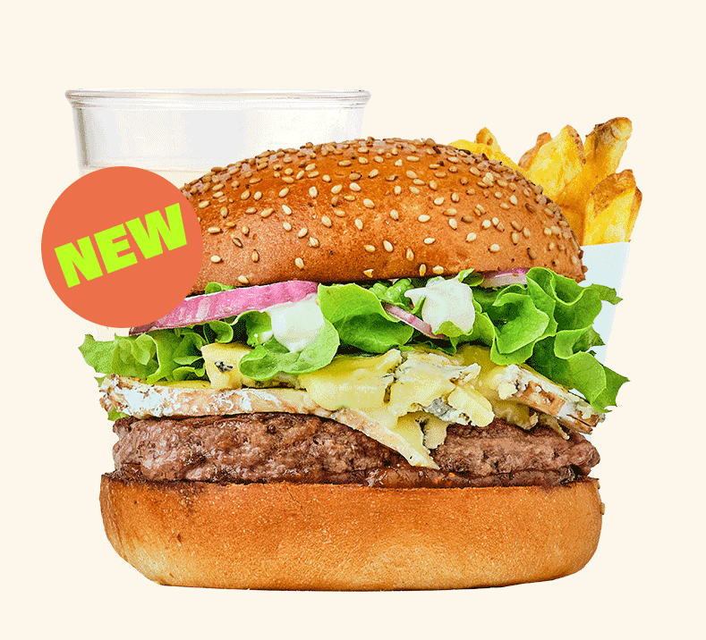 Blue Cheese (Pain BB légèrement brioché garni d’un steak de boeuf frais 100% pur boeuf, de 2 tranches de fourme d’Ambert au lait cru, de salade, de confiture figue et miel, d’oignons rouges accompagnés de mayonnaise) + homemade side au choix + BB Drink