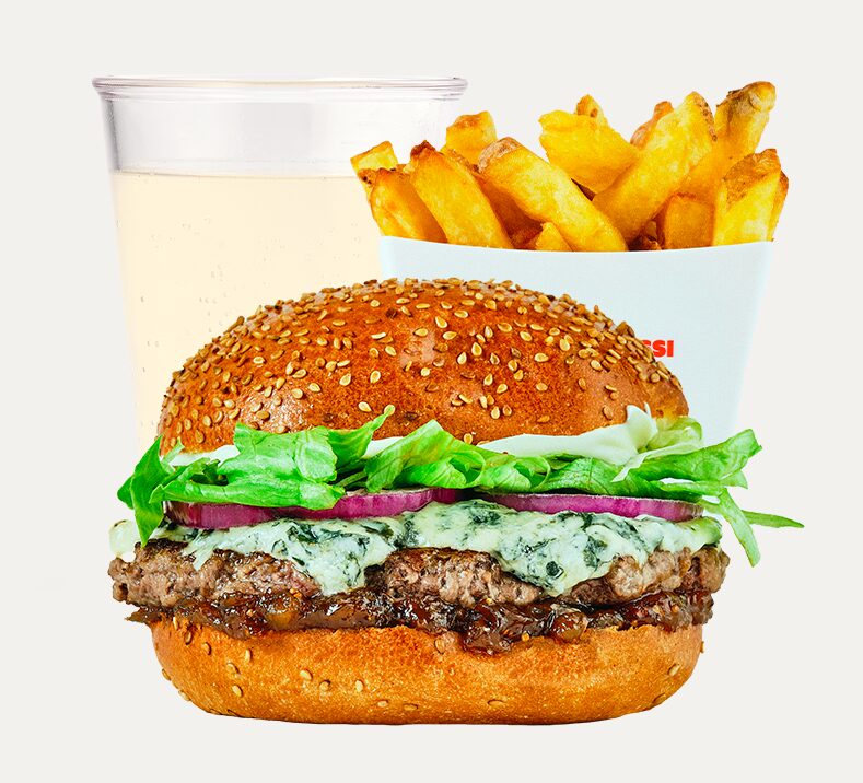 Blue Cheese (Pain BB légèrement brioché garni d’un steak de boeuf frais 100% pur boeuf, de 2 tranches de fourme d’Ambert, de salade, de confiture figue et miel, d’oignons rouges accompagnés de mayonnaise) + homemade side au choix + BB Drink