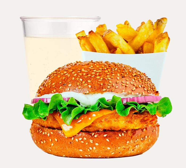 Chicken Cheese (Pain BB légèrement brioché garni d’un pané de poulet croustillant, d’une tranche de véritable gouda, d’oignons rouges accompagnés de notre sauce tartare) + homemade side au choix + BB Drink.