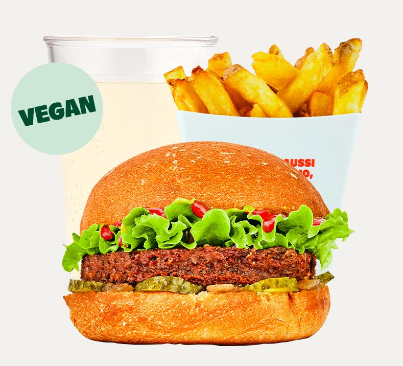 Vegan (Pain BB vegan garni d’une galette de seitan aux légumes d’hiver, de salade, de confit d’oignons, de cornichons croquants accompagnés de sauce barbecue & ketchup) + homemade side au choix + BB Drink