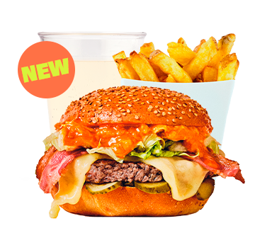 Pain BB légèrement brioché garni d’un steak de bœuf frais 100% pur bœuf, de 2 tranches de véritable Cheddar, de 3 tranches de chorizo, de tomate, accompagnés de notre sauce…